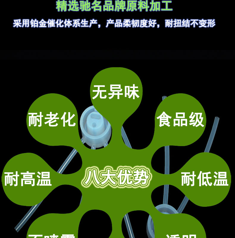 采用進口硅膠材料,模壓成型,內(nèi)壁平滑,壁厚均勻;常規(guī)60度(邵氏硬度值20-80度);耐溫范圍廣(-50~+280℃),可以適應(yīng)高、低溫設(shè)備需求,并耐老化。常規(guī)PE袋+紙箱包裝,特殊要求可按客戶標(biāo)準(zhǔn);產(chǎn)品符合SGS、FDA、LFGB、生物相溶性等;用于灌裝機、蠕動泵專用、醫(yī)療醫(yī)用器械、輸液泵等。